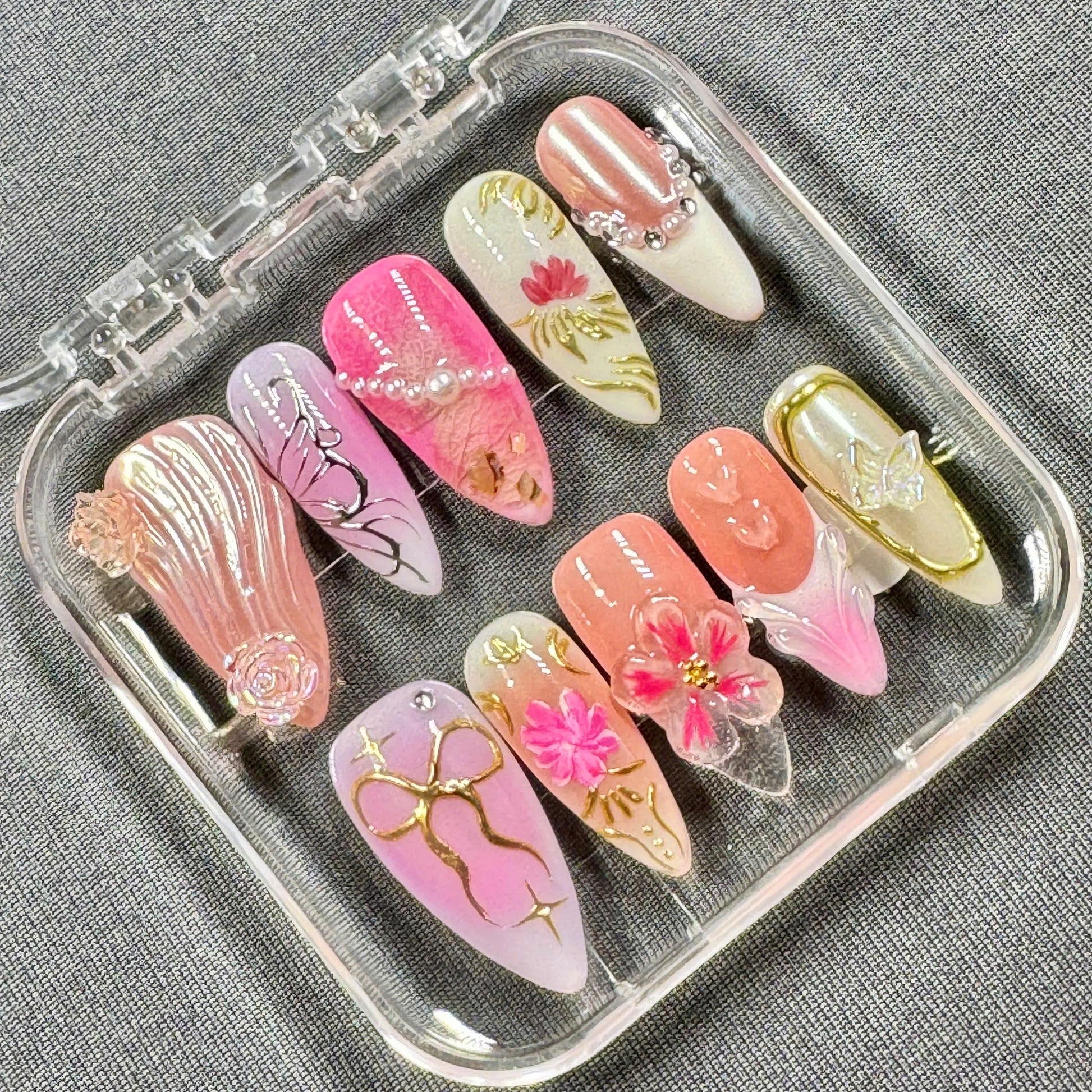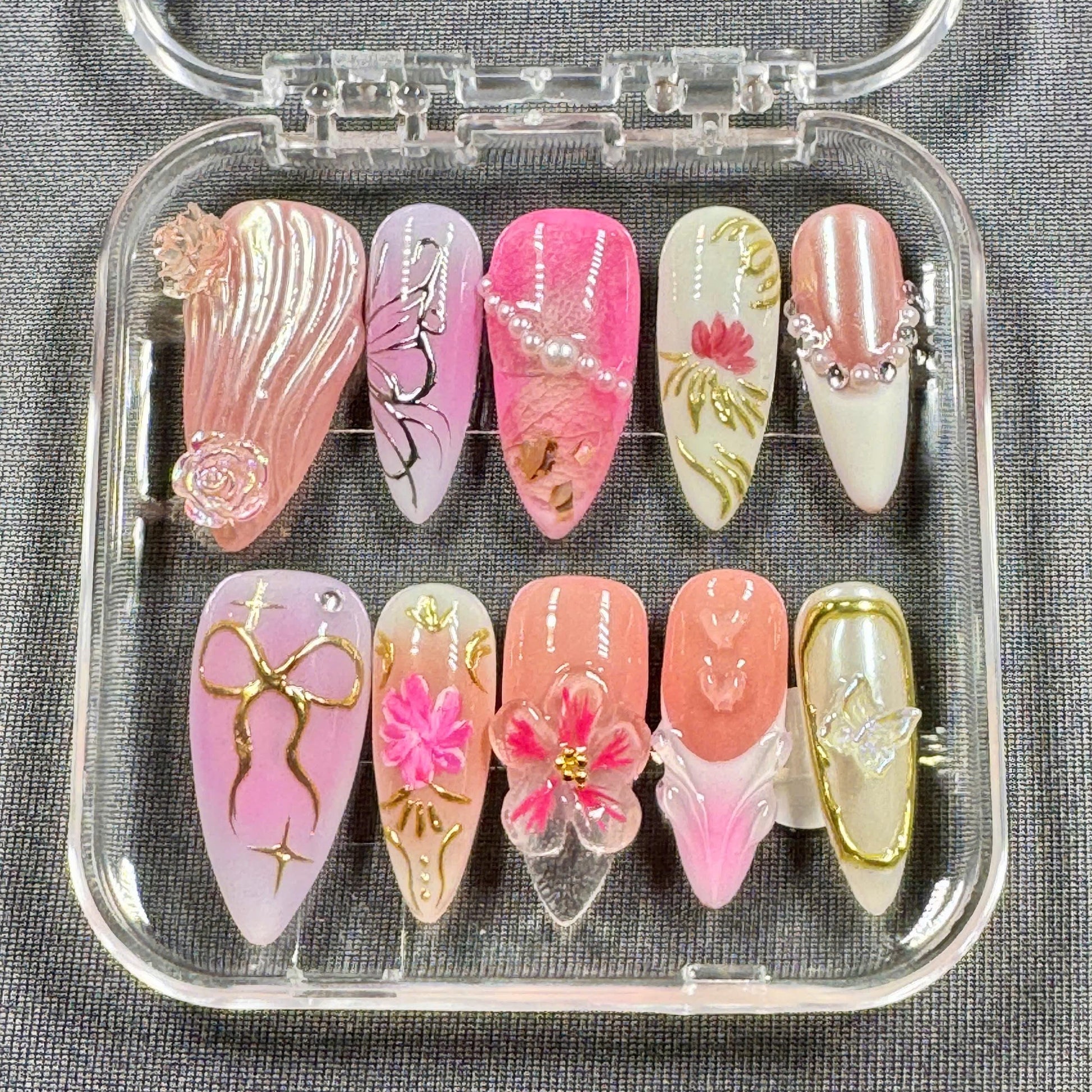 Blooming Grace is a fairytale captured on your fingertips. This luxurious set blends soft pastel pinks, blooming 3D florals, shimmering butterflies, and glistening pearls into a magical garden of hand-drawn nails. Finished with gold foil accents and transparent sculptural details, itβs an enchanting choice for any wedding, vacation, or self-care moment.