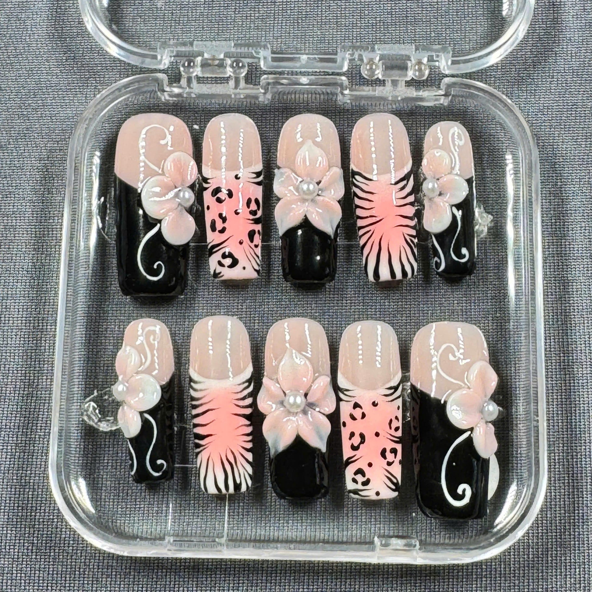Blush Safari Bloom Press On Nails β Nude Black Mix with 3D Flowers & Animal Print | Gift for Her